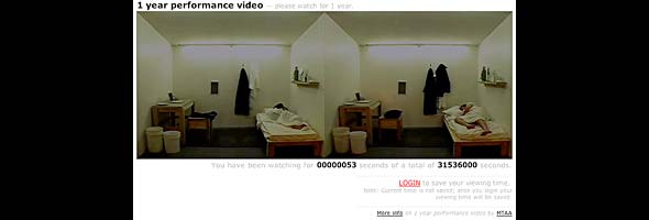 Si comparamos este trabajo con otro proyecto de Turbulence, 1 Year Performance Video de MTAA (12) el contraste en interés emocional del trabajo es enorme. La obra de MTAA es la traducción tecnológica de la performance de gran potencial emotivo de Samm Hsieh, en la que se encerró un año en su estudio en 1978 (13), de modo que se libera a los artistas de tener que soportar el confinamiento original. M. River y T. Whid conectaron unos vídeos de sí mismos a una aplicación, que hábilmente ofrece la ilusión de retransmisión en vivo por Internet de los artistas encerrados en sus estudios. En esta recreación no se intenta esconder de ningún modo los trucos técnicos, al contrario se enfatizan en una declaración. Este énfasis hace que la parte emocional o atractiva, del trabajo desaparezca casi por entero. 1 Year Performance Video se dice forma parte de una tradición o tendencia de recreación de trabajos artísticos más antiguos. Sin embargo, en el entorno de la web también se vuelve parte del mundo de los juegos. Éste es un art game. Éste es un juego de arte, en este caso incluso hay un premio: la obra misma, una vez el espectador se las ha arreglado para hacerla funcionar durante un año. Hay una lista con los mejores jugadores. Se consigue cautivar al público a través de los “desafíos” tecnológicos. Pareciera que desafían a la audiencia a ser como el artista, como en la performance de Sam Hsieh: esta vez no están metidos en una caja, sino enganchados a ella. Existe la ilusión de resistencia física cuando de hecho la audiencia sólo tiene que hacer lo que hicieron los artistas: lograr que la máquina haga el trabajo por ellos. En realidad, el único desafío en este juego es no olvidar encenderlo cada vez que estás en línea.