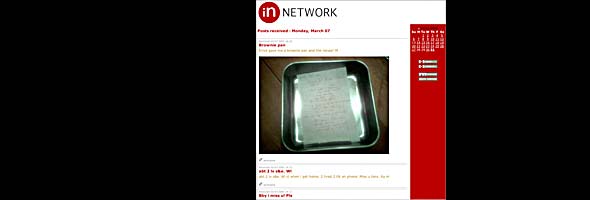 IN Network usa el formato de blog (weblog). El blogging es una versión inmensamente popular del diario en línea. Es usado para todo tipo de propósitos, desde reportes locales sobre la situación en Bagdad hasta orgullosos padres mostrando las fotos de su bebé. La cualidad más fuerte de un blog es que es tan fácil de usar que trabajar con él es como dibujar o escribir en una hoja de papel: la mano del usuario (blogger, artista, escritor) tiene un impacto muy directo en el resultado. Se trata de un software con gran potencial expresivo para sitios web, pero sigue necesitando talento, perspicacia e ideas para hacerlo funcionar, para crear algo especial con “inteligencia bloggeana”, al igual que se hace con tinta y papel. IN Network muestra lo que los artistas pueden hacer con el blogging. Muestra que no es el software sino la persona que lo aplica lo que marca finalmente la diferencia. La selección de grabaciones, fotos y textos, la coherencia y ternura extrema de su contenido y la manera en que los artistas usaron la concisión del formato blog ha producido un documento inmensamente poderoso. Aporta una sensación de documental o de película muy potente.